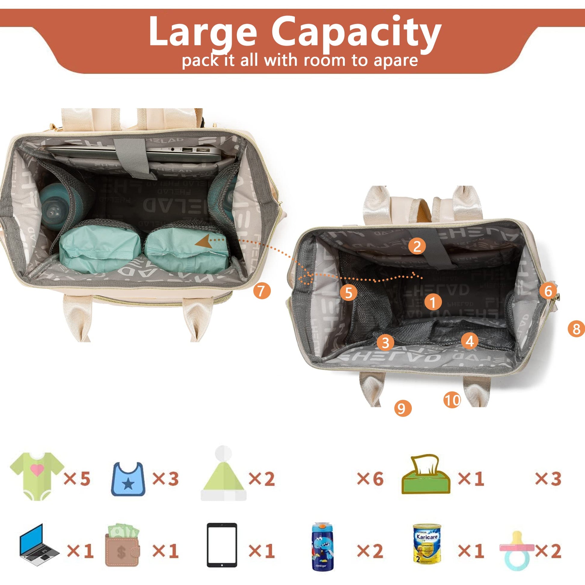 Sectional inside for diapers, bum cream, clothing, grooming kit,emergency kit, and a pocket for all mum's personal things like cellphones, keys, lipstick, etc.
