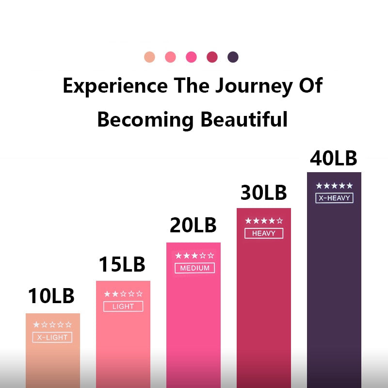 We have 5 styles to choose from-Light Yellow- Lowest resistance (10LB) to Purple highest resistance (40LB)