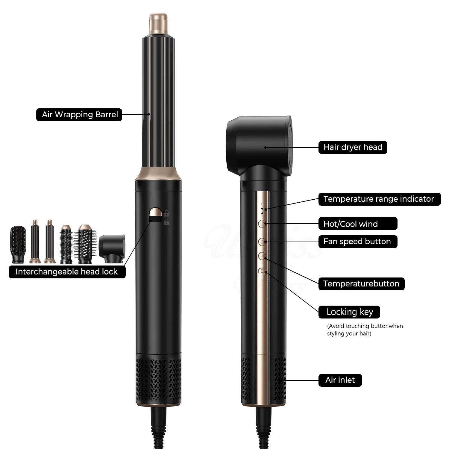 - Includes a high-speed ionic hair dryer, a hair dryer with diffuser, two 30mm air curling irons, a straightening brush, and a styling thermal brush.
